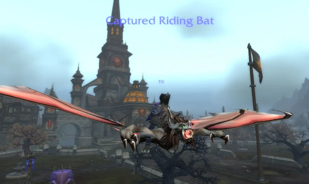 После этого меня куда-то забросило, передо мной был просто экран без моего персонажа, ничего не было доступно кроме меню. Я решил не рыпаться, и терпение мое было отблагодарено. Сначала откуда-то издалека появился мой персонаж на летучей мыши, он пролетел через меня и улетел в другую сторону. Попробуйте рассмотреть его на этом скрине: