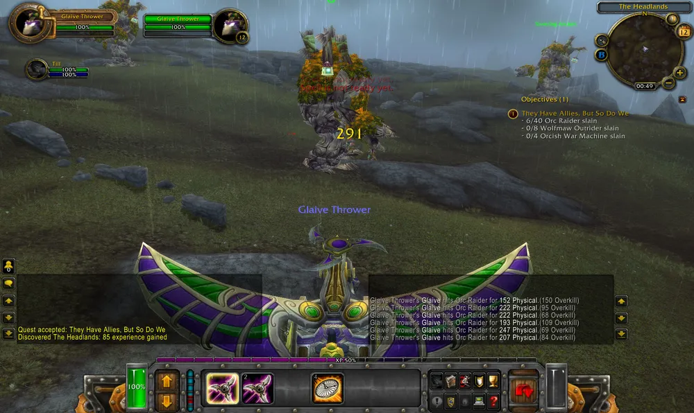 Выбравшись наружу и сделав несколько квестов по зачистке местности от "потревоженных духов предков", я наконец-то добрался до пристани. Там не долго думая, меня посадили на какую-то монструозную машину ночных эльфов и отправили в поля косить мобов.
