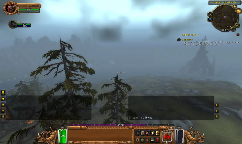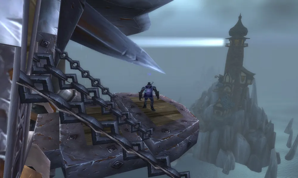 После этого началась какая-то забагованная феерия. Такого я еще не видел. Меня посадили на гиппогрифа и отправили с секретной миссией унитожить ордынскую летающую крепость 1 в 1 похожую на Молот Оргрима, летающий в Ледяной Короне. Вот только квест этот мягко говоря недоделанный. Выполнялся он у меня очень странно. Меня высадили на верхнюю площадку корабля, откуда мне пришлось прыгать вниз (спуска не было). Я там побегал, нашел пару мобов, толком ни в чем не разобрался. Тем временем корабль пришел в движение. Любуясь окрестностями, я вдруг обнаружил, что корабль уничтожен и мой квест засчитан.