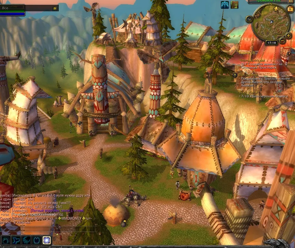 Лавки торговцев оружием,разнообразными побрякушками кругом шли по уступу.Огромные вековые ели конкурировали своими размерами с тотемами,находящимися на разных участках уступа.Около озера разместились кузнецы,постоянный звон молота о наковальню то и дело резал слух.Здесь же невдалеке располагалась доска приказов,дабы все были в курсе последних событий.Огромный гильдийский тотем стоял невдалеке от нее.Юго-западный подъемник вел на южную дорогу ,проходящую через самое сердце Мулгора.