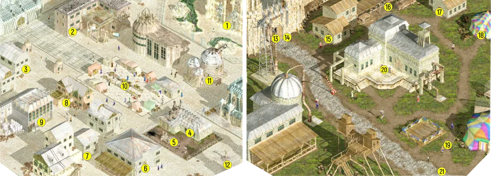 1 – храм Великих Героев. 2 – почта. 3 – жилой дом. 4 – кузница. 5 – кузнец Грын. 6 – дом стражи. 7 – гостиница. 8 – таверна “Ржавый меч”. 9 – Дерн. 10 – городской рынок. 11 – дом лекаря Жука. 12 – переход в пригород. 13 – вход в город. 14 – Позвизд. 15 – дом плотника Гомзы. 16 – плотник Вратко. 17 – дом Лодуса. 18 – шатер Хотена. 19 – акробаты. 20 – настоятельница монастыря Порелы Милосердной. 21 – переход на карту мира.