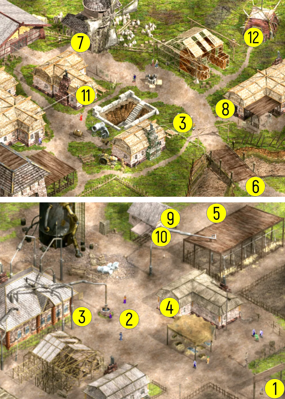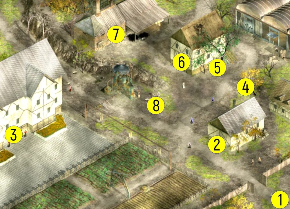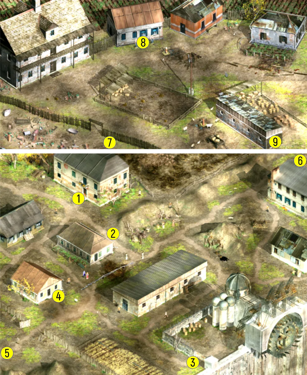 1 – Лагута. 2 – Бодус. 3 – Таислав. 4 – староста Гойко. 5 – место перехода на карту мира. 6 – переход на скотный двор. 7 – переход в деревню. 8 – скотник Ступа. 9 – кошара.
