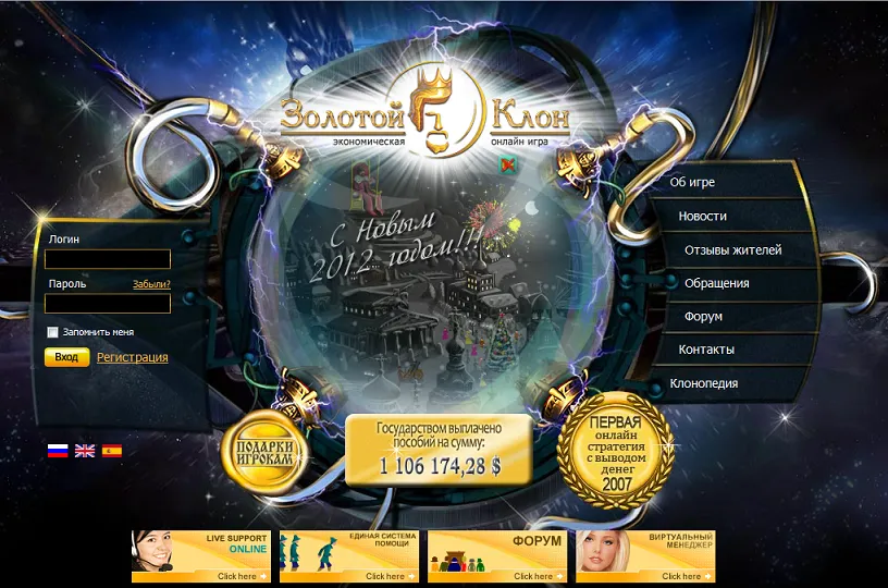 Поздравляем с Новым Годом участников игры Золотой Клон! Желаем здоровья и позитива. Обновления на сайте, новогодний флеш с салютом и видео о рождественских подарках. Присоединяйтесь к увлекательному миру Золотого Клона!