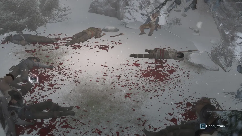 Нам нужно вернуться к матери рода и рассказать об успехе. Но на подходах к пещере мы видим кровь, а в пещере, как вы уже догадались – трупы. Лишь матерь рода осталась в живых, но ей осталось жить считанные минуты. Напоследок, мы узнаем, что это сделал Арнольд. Теперь мы будем мстить. Идем в ближайший лагерь синих мундиров, для того, чтобы узнать, где сейчас находится Арнольд. Приходим в лагерь и подслушиваем разговор. Для 100% синхронизации вам не нужно прятаться в кустах во время разговора. Не проблема, для этого есть волчий плащ и обозы с сеном. Во время разговоров узнаем, что обоз с рабами едет в крепость. А нам нужно остановить этот обоз, пока он не прибыл на место назначения. Прибегаем к обозу и с помощью волчьего плаща и волков убиваем врагов и освобождаем пленников. После всего этого задание закончится.
