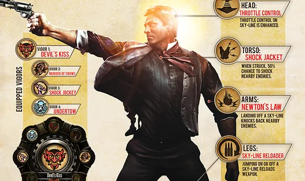 Букер может надеть до четырех видов снаряжения. Их применение повышает умения и мощь оружия или энергетиков Букера, а также дает ему доступ к новым боевым возможностям и необычной тактике. Снаряжение может быть одним из четырех видов – шапка (шляпа), рубашка или костюм, сапоги (ботинки) и брюки (штаны) и может располагаться в одном из четырех конкретных слотов. Одновременно можно надеть только одну какую-либо разновидность снаряжения, которая будет указана в своем слоте, так что даже если у вас есть две разные шляпы, можно носить только одну. (Что, в общем, логично). Конечно, вы можете хранить любое найденное дополнительное снаряжение в своем инвентаре и менять его, когда возникнет такая необходимость. Всякий раз, когда снаряжение выбрано и одето, играя дальше, вы можете найти совершенно другой, случайный набор снаряжения. Большинство снаряжения тщательно скрыто в локации, и его надо специально искать. Но бывает, так что оно будет валяться у вас на дороге, и вы всегда должны следить за тем, что попадается у вас на пути. Снаряжение может валяться на ступеньках лестницы, с которой вы сбегаете в бою, быть на крыше навеса, мимо которого вы пробегаете, быть под столом, в какой-либо комнате или в каком-нибудь закутке, рядом с другими предметами. Кроме того, вы получите сундучок со снаряжением каждый раз, как убьете Механика, поэтому всякий раз обращайте пристальное внимание на оставленные предметы, когда вы уничтожите одного из этих сердечных врагов!