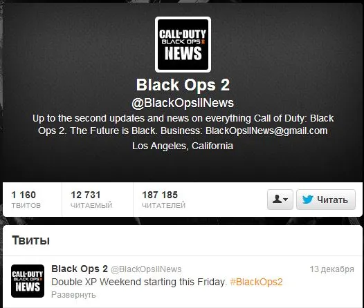 Твитер Black Ops 2 обрадовал всех поклонников сообщением о двойном опыте. Double XP будет на всех платформах (PC, Xbox360 и PS3) начиная с пятницы 14.12.2012 и закончится 17.12.2012. Желаю все быстрой прокачки ;-)