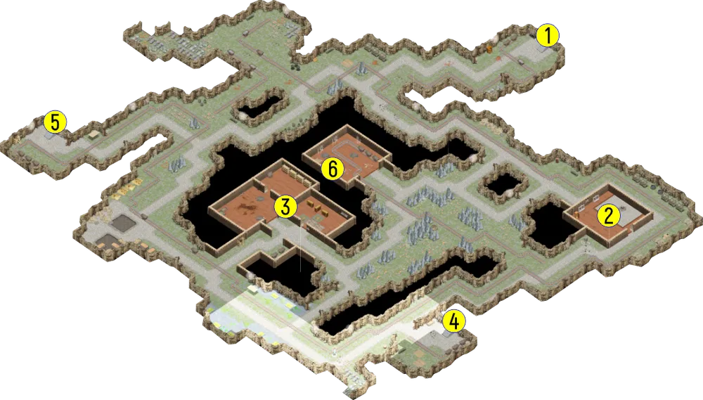 1 – переход в казармы. 2 – кузница. 3 – здание управления шахты. 4 – переход к интенданту Денизу. 5 – переход в башню разведчиков. 6 – переход на нижний ярус.