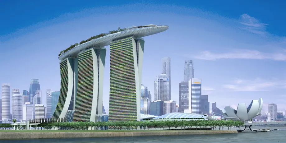 В Сингапуре состоится открытие курортно-гостиничного комплекса Marina Bay Sands. Три 55-этажных башни этого нового чуда света венчает трехпалубный корабль под названием "Небесный парк" площадью 12 400 кв.м. На его верхней палубе, на высоте 200 метров, расположен громадный 150-метровый бассейн с водопадом - самый большой бассейн под открытым небом, а также бары, рестораны и музей современного искусства. Издали создается впечатление, будто гигантский корабль возвышается над волнами на 200-метровой высоте.