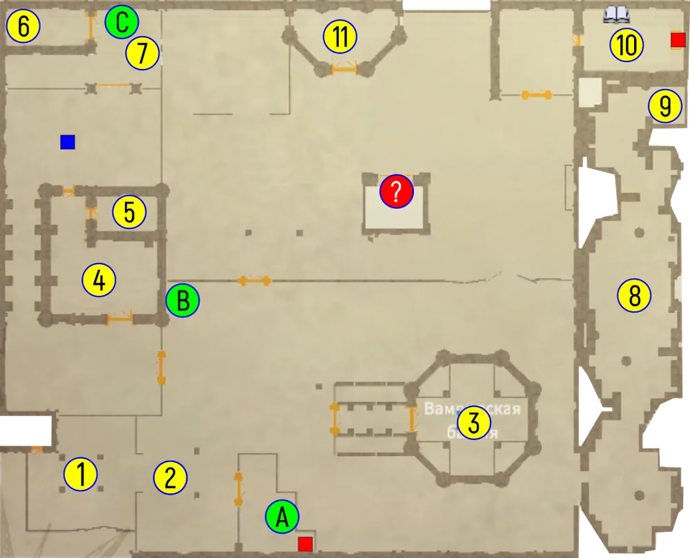 1 – телепорт (перемещение на поверхность). 2 – Кармелла. 3 – библиотека. 4 – торговец. 5 – телепорт (перемещает в таверну призраков). 6 – место падения из туалета. 7 – рычаг, отключающий газ.8, 9 – лестница (подъем на поверхность). 10 – археологическая экспедиция. 11 – залы загадок.