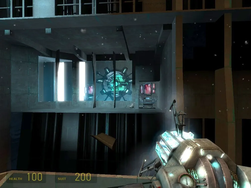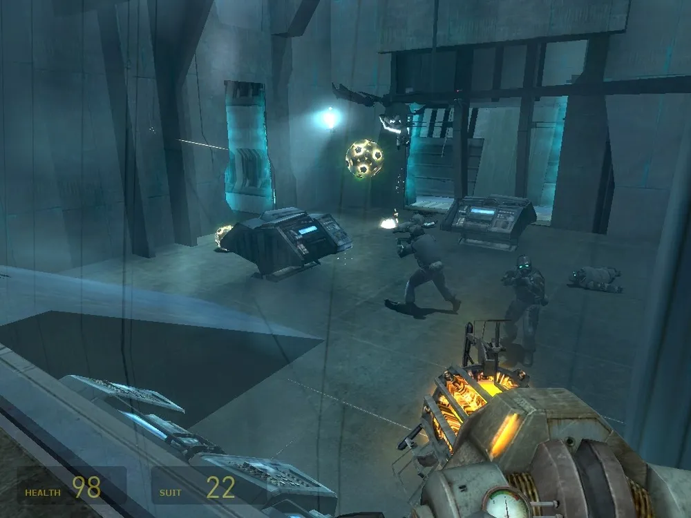 Выходим на мостик и видим пульсирующее ядро реактора. Нам необходимо перебежать на мостик слева в тот момент, когда ядро максимально сжато, иначе будет Гордон, запеченный в собственном соку. Пробегаем с ускорением (кнопкой Shift), по мостику и дальше в проход слева, где убиваем четверых солдат.