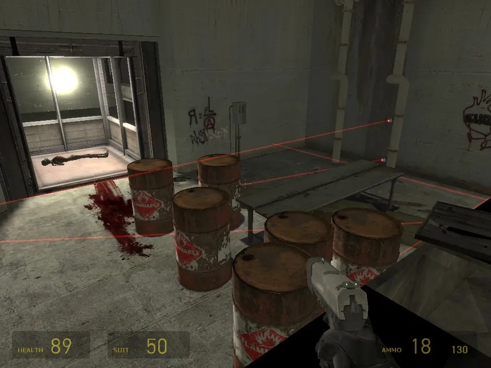 Ползем по трубе влево до лестницы, поднимаемся и ползем вперед до решетки. Под решеткой — хэдкраб — убиваем импульсами грави-пушки (2-3 удара) и спрыгиваем вниз. В правом дальнем углу комнаты — шкафчики с аптечкой и батарейкой, в самой комнате — разбиваемый ящик с батарейкой и патронами, а в левом углу — настоящее сокровище: за решеткой лежит пистолет, дробовик, осветительный патрон и ящик с плюшками. Сквозь решетку все это не пролезает, но один ее край загнут — хватаем добряки грави-пушкой и тянем к себе через дырку. Вуаля — мы при оружии.