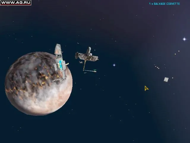 Капитан переметнувшегося на Вашу сторону эсминца Элсон сообщает, что он из сопротивления. Им не нравится диктатура Империи, и они хотят помочь Вам. Но для этого ему необходима связь. Единственный передатчик такой мощности находится на кладбище кораблей неизвестной расы. Не знаю, что это за раса – Карос, но то, что у нее был огромнейший флот – это верно. Однако приступим к прохождению. Начинайте разработку собственных крейсеров. Главной силой в этом уровне станут многоствольные или тяжелые корветы. Собирайте штук двадцать и идите в обход кладбища слева, так как оно охраняется автоматическими пушками. Ни в коем случае не берите тяжелый флот, иначе Ваши эсминцы с крейсерами будут самым наглым образом сперты. Потом их вернут, но уже без экипажа. К тому же без тяжелых кораблей можно вполне обойтись. Обойдя кладбище слева, подлетайте к остаткам корабля с передатчиком. Уничтожив пушки, охраняющие обломок, стыкуйтесь. Элсон смотается, пообещав помочь в дальнейшем флотом мятежников. Дальше можно прыгать из этого странного места.