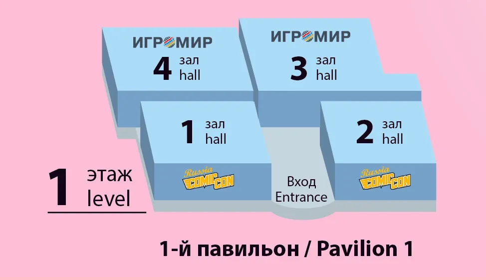 В павильоне всего четыре выставочных зала. Два из них отведено под ИгроМир (зал 3 и зал 4) и еще два под ComicCon Russia (зал 1 и зал 2). И опять же, чтобы минимизировать ваши шансы заплутать, кидаю схемку.
