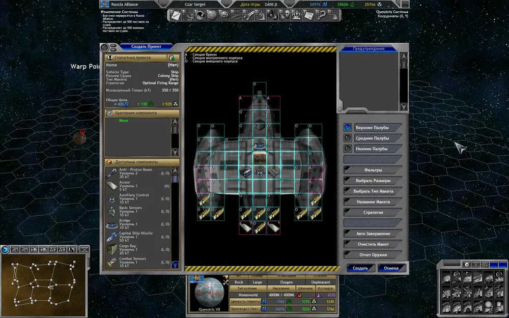 Собирается она так: критичесские компоненты в середину, все еденицы брони надо заполнить , Для ачала 4 лазерных орудия если нет урановых и 2 ракетные установки, потом ставим щиты 2-3 компонента и сканеры, остальное склад.