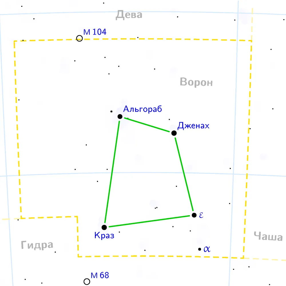 Относится к древним созвездиям. У Аполлона в спутниках был ворон, который по своим особенностям сильно отличался от обычных птиц. Именно в этом ключе созвездие получило такое имя.