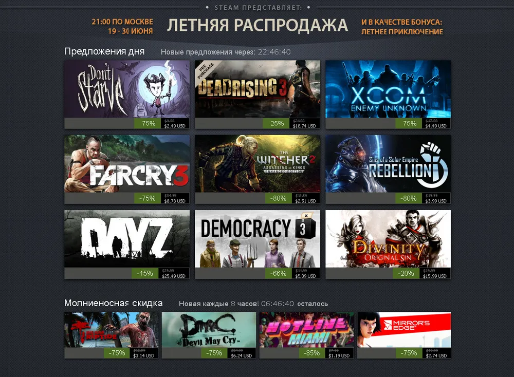 Началась долгожданная геймерами летняя распродажа в Steam. Спешите купить ваши любимые игры и участвуйте в бонусном летнем приключений. Распродажа будет проходить с 19 по 30 июня. Каждые 24 часа будут новые предложения, т.е. каждый день в 21:00 по Московскому времени. Также голосуйте за один из наборов игр, который будет представлен как следующий выбор Сообщества. За каждое третье голосование вы получите карточку летнего приключения.