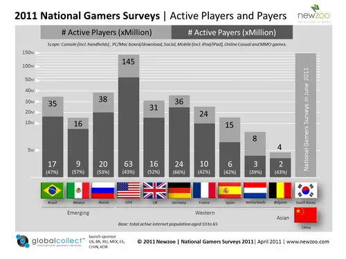 Маркетинговая фирма Newzoo (с очень серьезными клиентами — Blizzard, Warner Bros, EA и даже PopCap) выложила в открытый доступ собранные ей в июне 2011 года статистические данные — про то, сколько людей, во что и на чем играют в десяти странах мира, включая Россию. Инфографики красивые, статистики много. Из нее следует, что наша страна занимает достойное место и верной дорогой идет: систематические игроки составляют более четверти населения (38 миллионов из 141). Для сравнения, в Бразилии — 35 млн из 190.
