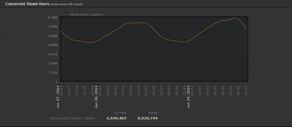 8020813 одновременных пользователей было зарегистрировано в Steam 29 июня 2014 года во время Steam Summer Sale Encore Day. Летняя распродажа была запущена в магазина на прошлой неделе и завершилась 30 июня 2014 года.