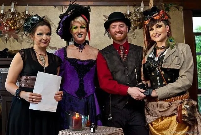 Персонажи Жюль Верна и пиратская классика. Название этого стиля - стимпанк, правда к панкам в общепринятом понятии это не имеет никакого отношения, название всего лишь говорит о необычности. Популярность стимпанк обрел благодаря ролевым играм, их еще называют погружением в эпоху.