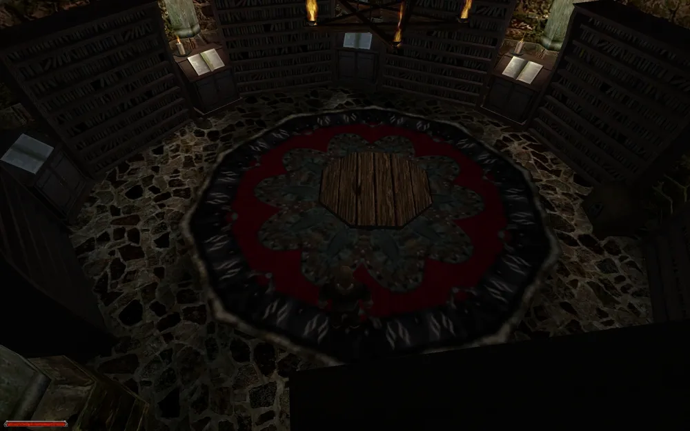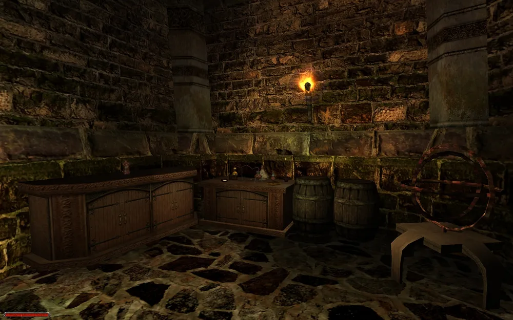 На нижнем этаже можно обнаружить стойку с факелами, склянками и бутылками, сундук с парой свитков и золотом, а так же две скамейки, на которых пучками валяются самые разнообразные травы, столь ценящиеся алхимиками. А еще, что важнее, зачарованный пояс, дающий прибавку к силе. Не забудьте поднять три золотые монеты, рассыпанные возле распложенных вокруг ящиков и бочек.