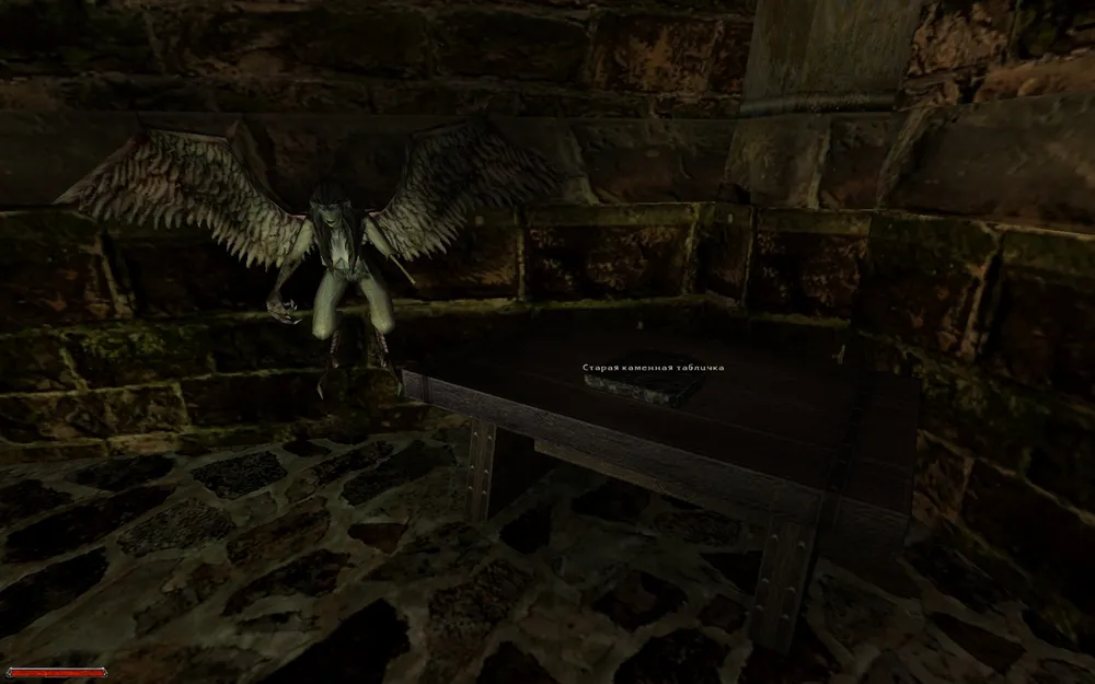 Получив, что хотели, схватим со стола в углу, возле чучела гарпии (с каким, однако, вкусом интерьер обставлен) старую пообколотую каменную табличку, с непонятными надписями. Если попробовать ее прочесть – перед героем всплывет сплошная абракадабра. Немного отвлекусь и скажу, что это еще одна потрясающая мелочь игры – данную табличку можно будет прочесть позже, выучив язык, на котором она написана. Так что пока это просто предлог, чтобы еще раз поговорить с Ксардасом, полностью ушедшем в одну из своих любимых рукописей. Сам не знаю, что он видит такое в паре строчек о все тех же зельях, но поговаривают, что это вовсе не сухой текст, который виден простым смертным…