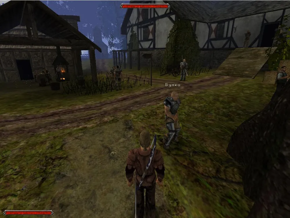 Там трудятся наемник Беннет и крестьянин Ходжес. Беннет - искуснейший кузнец-рудоплав, кроме того, умелый ювелир и оружейник. Вообще, золото, а не человек. Беннет впоследствии станет одной из самых значимых фигур во всей сюжетной линии. Пока вы еще не наемник, Беннет просто поболтает с вами и посетует на отсутствие руды. Если же вы УЖЕ не наемник, а , например, ополченец, то получите от ворот поворот в грубой форме. Так-то.