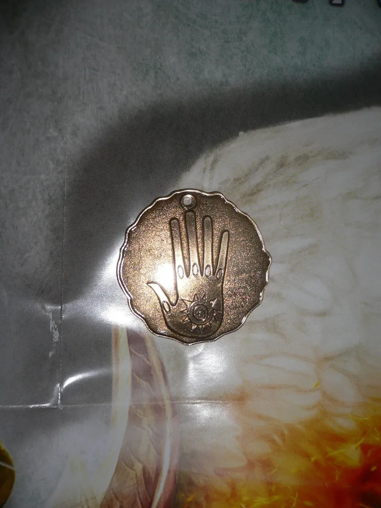 [B]2) медальон[/B]. Если детальнее, то медальон в виде руки, довольно крупный, вес ощущается. Прекрасная работа! Я не ожидал такого. Также идет маленькая веревочка и все это в пакетике. Медальон приносит удачу и/или защищает, примерно такое у него назначение.