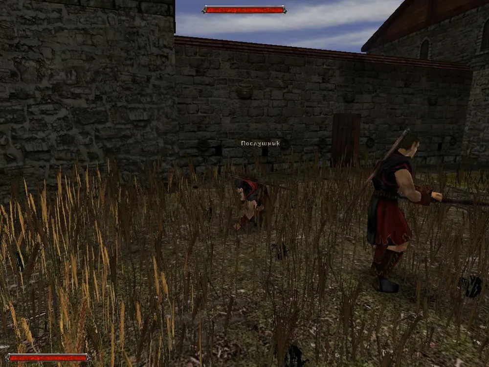 Тогда есть шанс наблюдать вот именно то, что отражено на скрине. То есть, помимо зерновых полей (на пер. плане), мы еще имеем счастье лицезреть толпу послушников, стройно направляющуся куда-то в сторону подвала, а также мага Парлана.