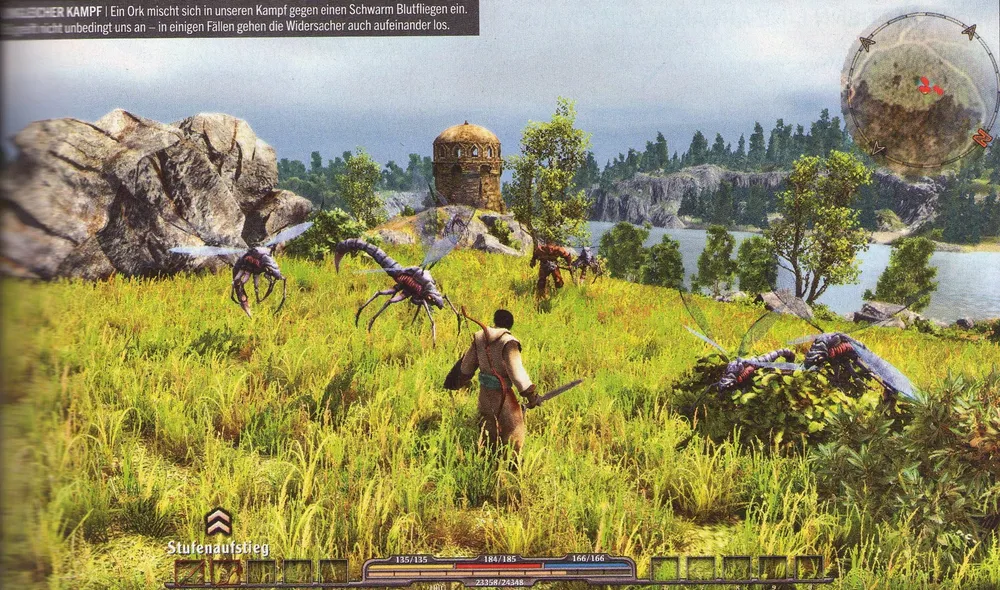 А вот за стенами города нас ждет совершенно иная картина. Потому что открытые регионы, по нашему мнению, смотрятся пока что пустынными. Ни разу нам не встретился путник на дороге, даже поля смотрятся как-то осиротело. Там и сям попадаются группки монстров, но и на них как будто сэкономили. В то время как в «Готике 3» и «Ризен» каждые 10 шагов выводили игрока на толпу, а каждые 20 шагов грозили новым квестом, земли «Аркании» кажутся такими одинокими… Ну или это всего лишь малая часть игры, которую мы видели.
