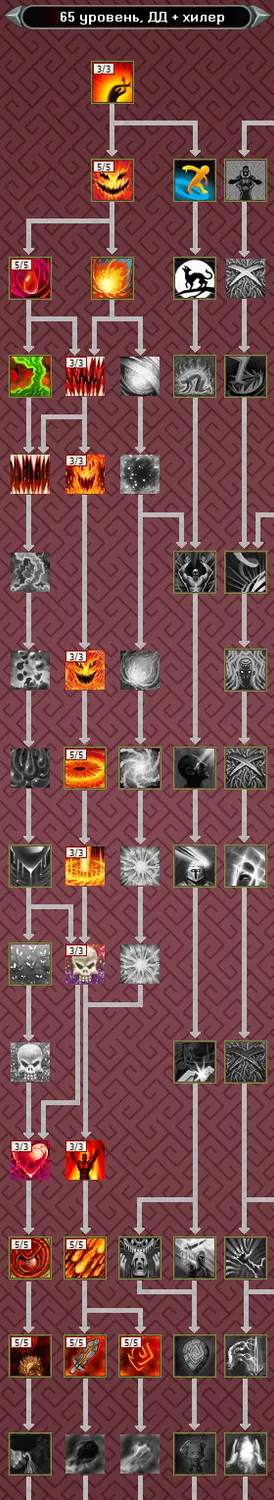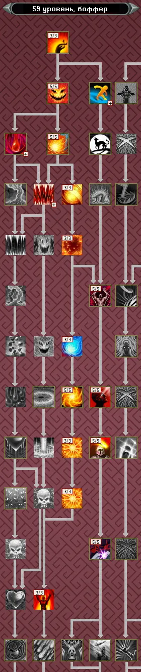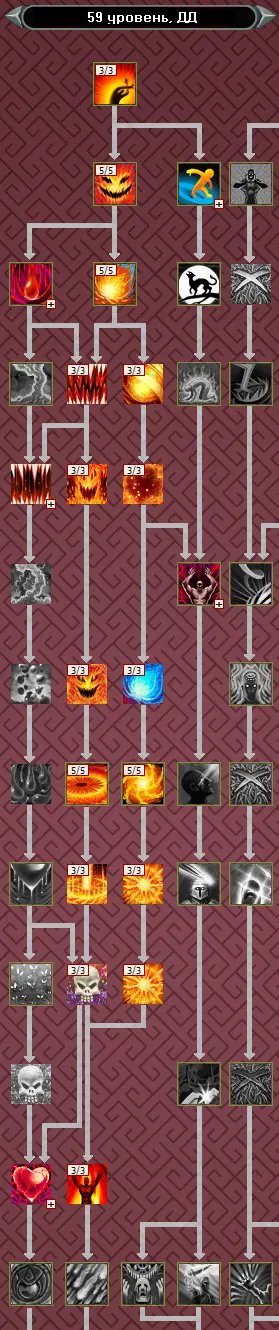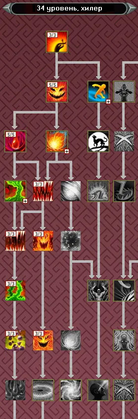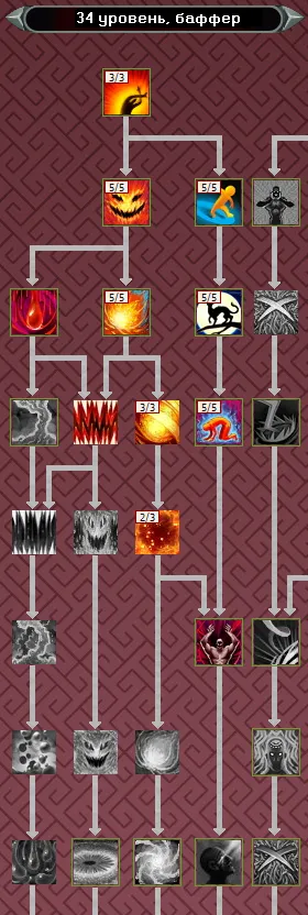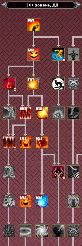 Основным заклинанием из ветки мистицизма до 40 уровня, является Удар Вампира. В свою очередь, в ветке усиления - это Гнев Огня, актуальный вплоть до 34 ур. Поэтому, изучаем в первую очередь их, не забывая про пассивки, чтобы к 34 уровню иметь следующую раскачку: