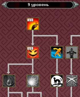 Как видим, на этих уровнях выбор у нас невелик. Вначале учим Ожог, затем - Гнев Огня. К 9-му уровню раскачка должна быть такой: