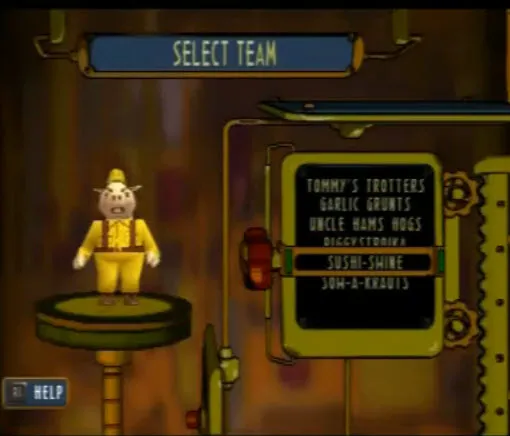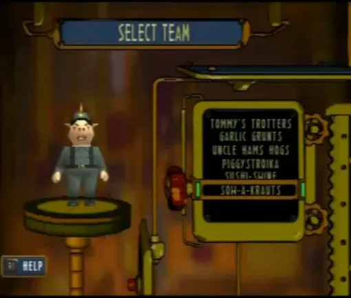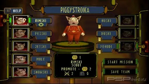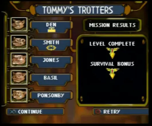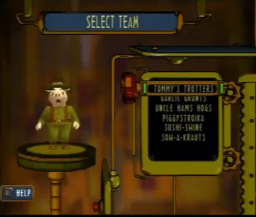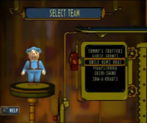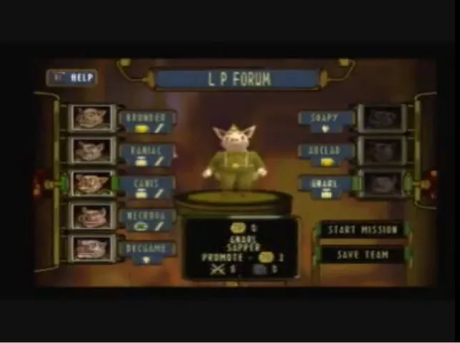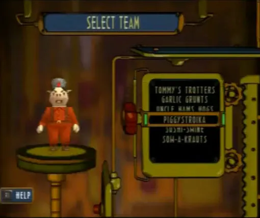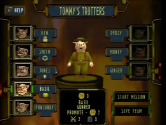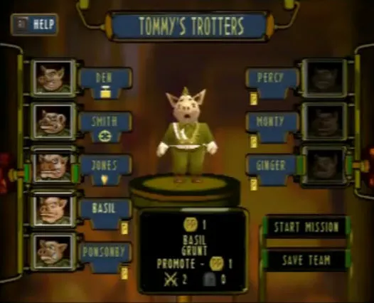 Вообще Hogs of War является пародией на Вторую мировую.Выбираем к примеру янки.Перед нами появляется меню команда.Лимит - 8 свиней.По умолчанию стоит 3 солдата.Также с самого начала доступна 1 медалька,с помощью которых можно повышать ранг подопечных и увеличивать их боеспособность.Медальки дают за пройденную миссию,а также бонусные за выполнение определенных условий(все должны остаться в живых,забрать ящик и.т.д.)