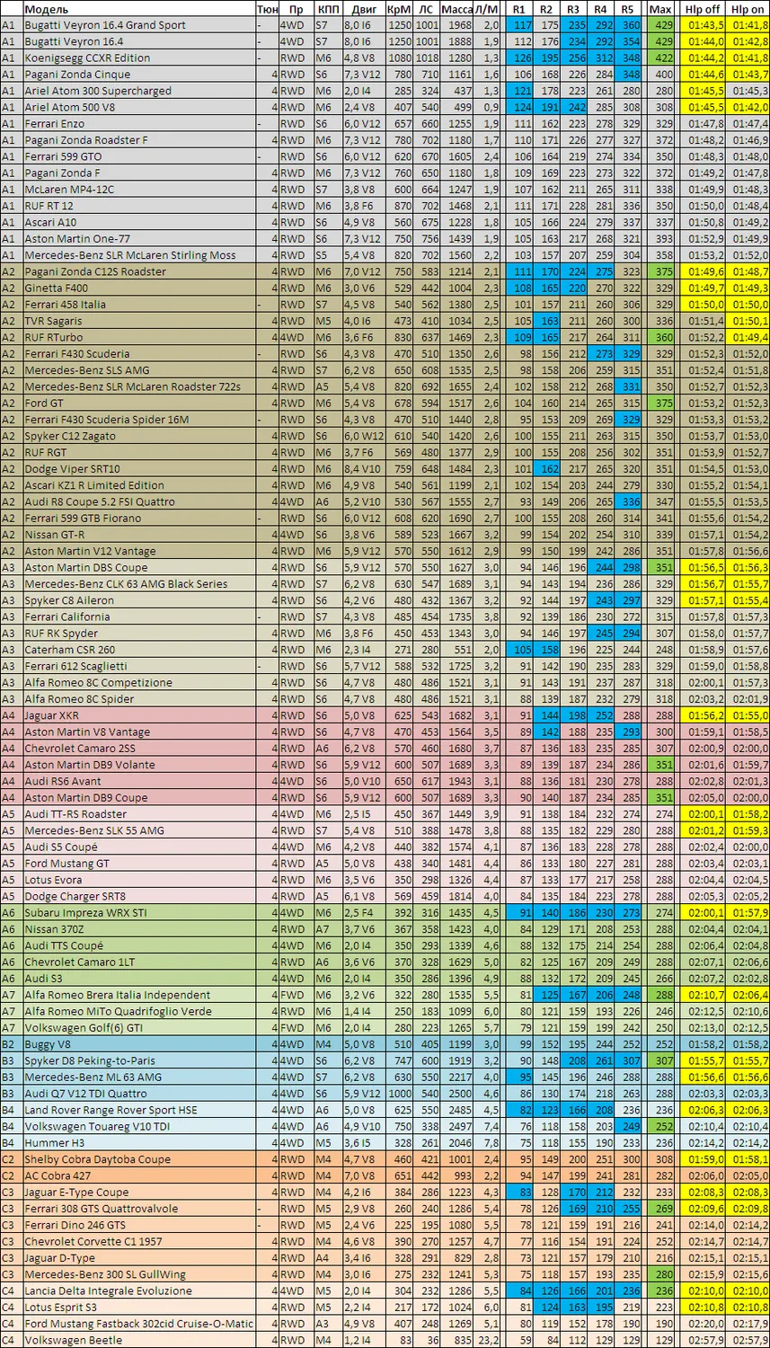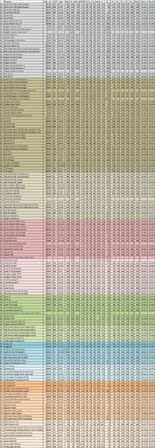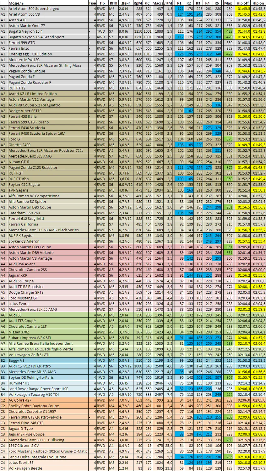 - Все протестированные машины с максимальным имеющимся тюнингом, сортировка по классам.