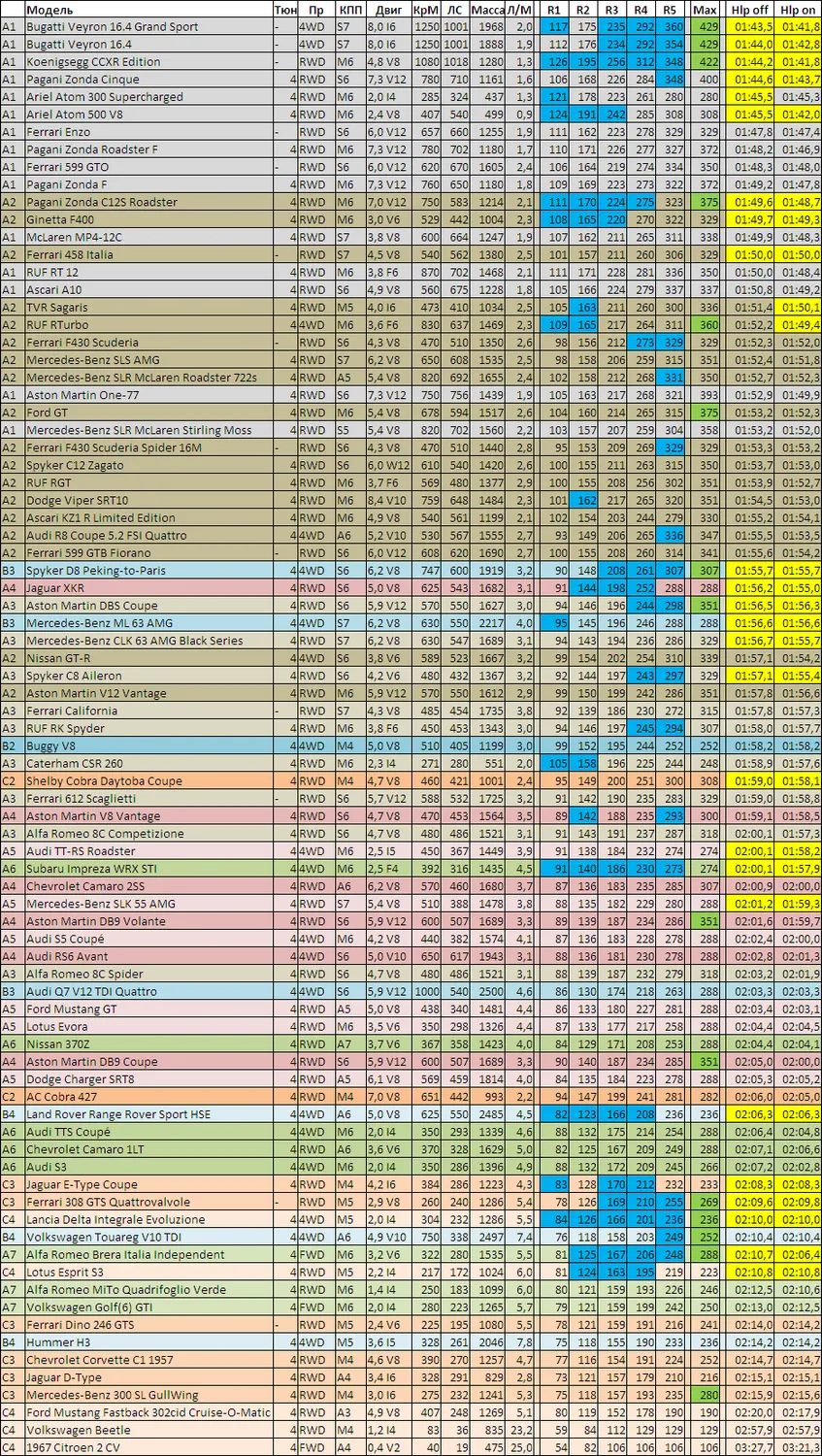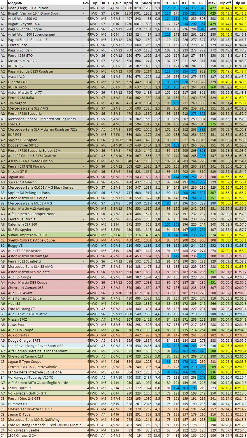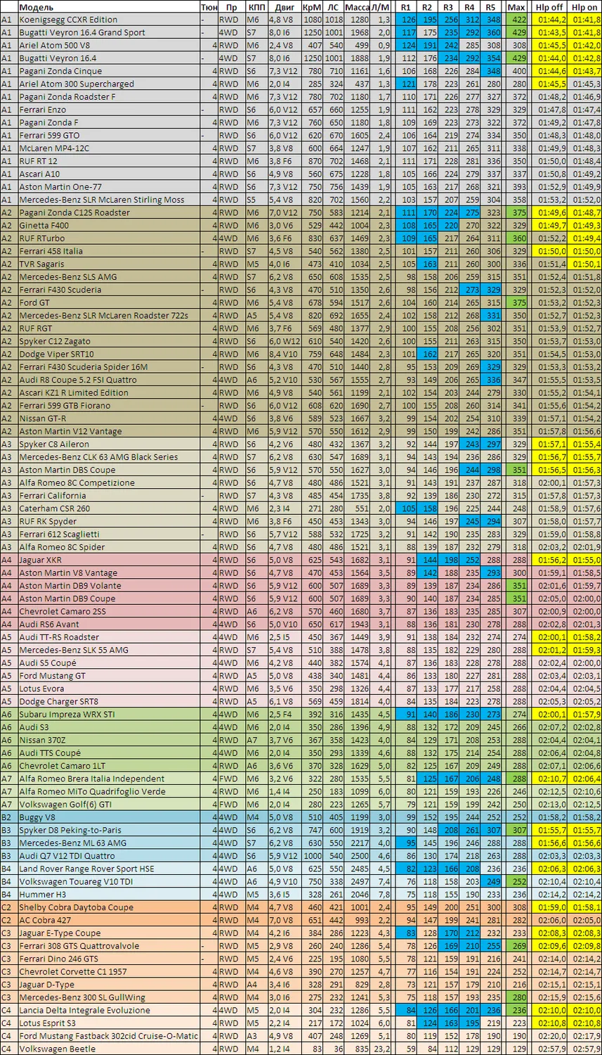 - Все протестированные машины с максимальным имеющимся тюнингом, сортировка по классам.