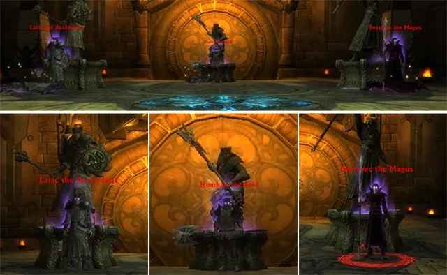 Энкаунтер состоит из 3х боссов: Humbart the Bold, Laric the Ascendant и Derribec the Magus. Каждый из них имеет специальную абилку. Humbart имеет фронтальный кливDeathly Whirlwind и откидывающую абилку. Танкуйте босса спиной к его статуе чтобы не улетать он нокбэка. Derribec имеет абилку Life Rend. Это просто дд каст в один таргет. Laric имеет хил абилку Unholy Mending которая должна постоянно или по мере возможности прерываться.