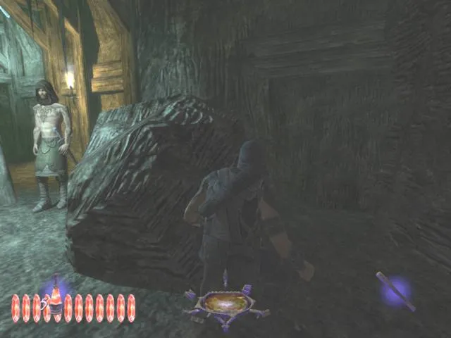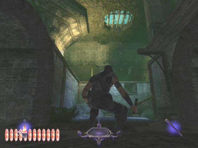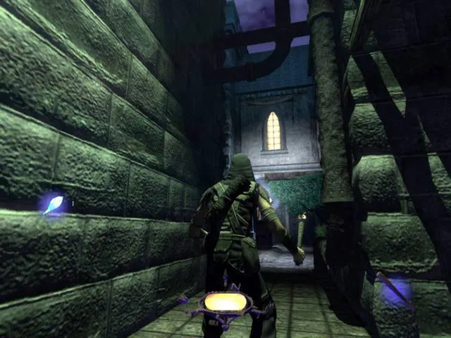 Сходство Thief 3 с молодым и наглым конкурентом в лице Splinter Cell не ограничивается видом от третьего лица. Гаррет, как и Сэмми Фишер, также обзавелся зеленым глазом, правда, только одним. Вместо правого ока в голову главгероя отныне вмонтировано хитрое устройство, которое позволяет видеть в темноте (увы, не очень хорошо), а также работает как портативный бинокль. Лицезреть процесс выдвижения чудо-гаджета из глазницы авторы, к сожалению, не позволяют — камера автоматически переходит в вид от первого лица. Зато зеленая лампочка в темном углу подозрительно напоминает огоньки московских таксистов на допотопных “Волгах”. Продираясь сквозь мрачные подземелья, Гаррету периодически хочется бросить: “Эй, шеф, два счетчика!”