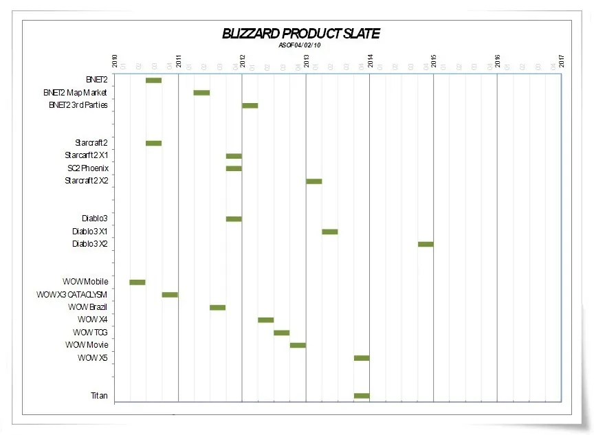 В Сеть утек план релизов компании Blizzard на четыре ближайших года. Судя по этому графику,Из-за утечки которого был уволен бывший генеральный директор китайского отделения Blizzard, долгожданная Diablo 3 и два дополнения к Starсraft 2 (помимо обещанных кампаний за зергов и протоссов разработчики готовят непонятный StarCraft 2 Phoenix) порадуют игроков в четвертом квартале следующего года.И самое главное, на этом же графике присутствует и таинственный проект Titan, который, по всей видимости, является той MMORPG, анонс которой нас ожидает в 2012 году. смотрите сами: