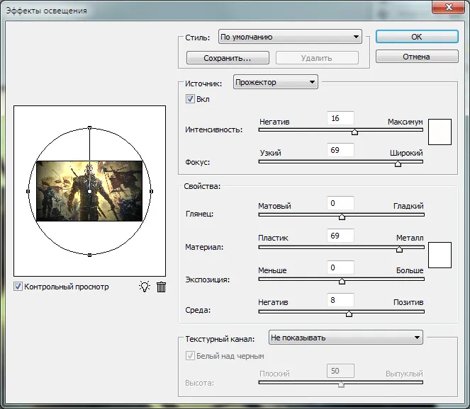 Чтобы решить вторую проблему я создал розоватый слой поверх всего с режимом смешивания "Мягкий свет" (Soft light), картинка стала более красновато-зловещей. А затем применил к слою уже знакомую слой-маску. В её центре чёрно-белый градиент, который я после сжал сверху, а внизу наоборот растянул. В итоге получился эффект столба света, освещающего Геральта сверху. Теперь он стал сильнее выделятся. Но для усиления эффекта я скопировал все слои ещё раз, а потом склеил их. К полученному изображению был применен фильтр Рендеринг -> Эффекты освещения, который немного затемнил фон и высветлил ещё сильнее Геральта. Я остался доволен.