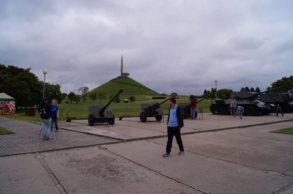 На пути из минского аэропорта в офис компании Wargaming мы сделали остановку у мемориального комплекса «Курган Славы». Именно здесь, в нескольких десятках километрах от восточной окраины города, летом 1944 года была окружена и наказана группировка немецко-фашистских войск, насчитывавшая свыше 100 тыс. бойцов. Вся композиция, а это 35-метровый курган, 4 стелы в виде штыков (символизирующих собой четыре фронта: 1-ый Прибалтийский и 1-ый, 2-ой и 3-ий Белорусские) и опоясывающее скульптуру металлическое кольцо с барельефами, была воссоздана в 1969 году.