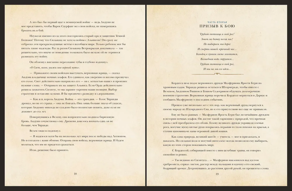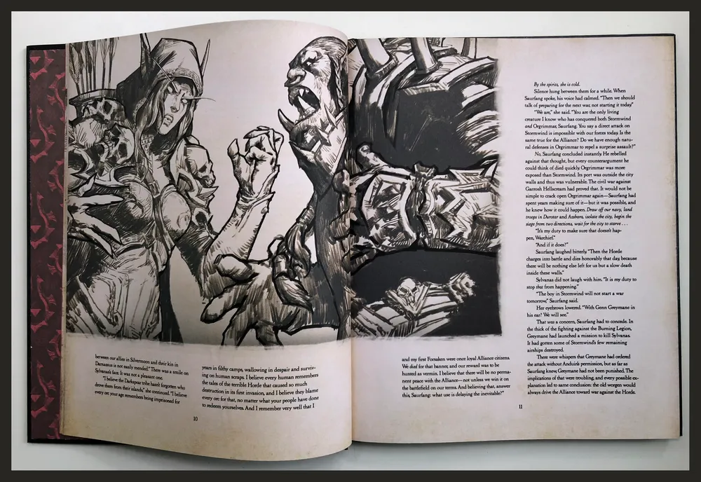 Внутри коробки нас по обыкновению первым встречает печатное издание. Однако это не привычный артбук, а две собранные под единой обложкой новеллы, рассказывающие о сожжении Тельдрассила с точки зрения каждой из участвующих в конфликте фракций. Книга, и в этом заключается ее главная фишка, двусторонняя. Начав читать ее с одной стороны, вы познакомитесь с историей глазами Альянса. Перевернёте, и можно узнать правду, как она видится Орде. Соответственно, обе стороны обложки, в остальном совершенно одинаковые, различаются изображенным на них символом – ну, чтобы никому не было обидно, ни играющим за Альянс, ни готовым всех порвать за Орду. Паритет фракций и уважительное отношение к приверженцам каждой из них – таким, думаю, мог бы быть девиз данного издания.