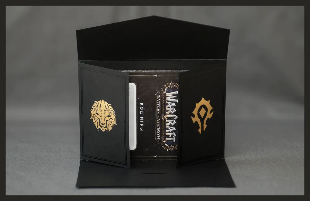 Под альбомом с новеллами, в специальных углублениях покрытой бархатистым напылением вставки, заполняющей внутренний объем коробки, прячутся само дополнение, саундтрек к нему и памятный вещественный трофей. Все как всегда, думаете вы? Так, да не совсем. В отличие от изданий предыдущих аддонов в коллекционке «Битвы за Азерот» нет дисков. Игра и музыка представлены листовками с кодами, активируемыми на соответствующих интернет-страничках. Обе они помещаются в черный стильный конверт с золотой эмблемой игры на внешней стороне и золотыми же эмблемами фракций на внутренних клапанах.