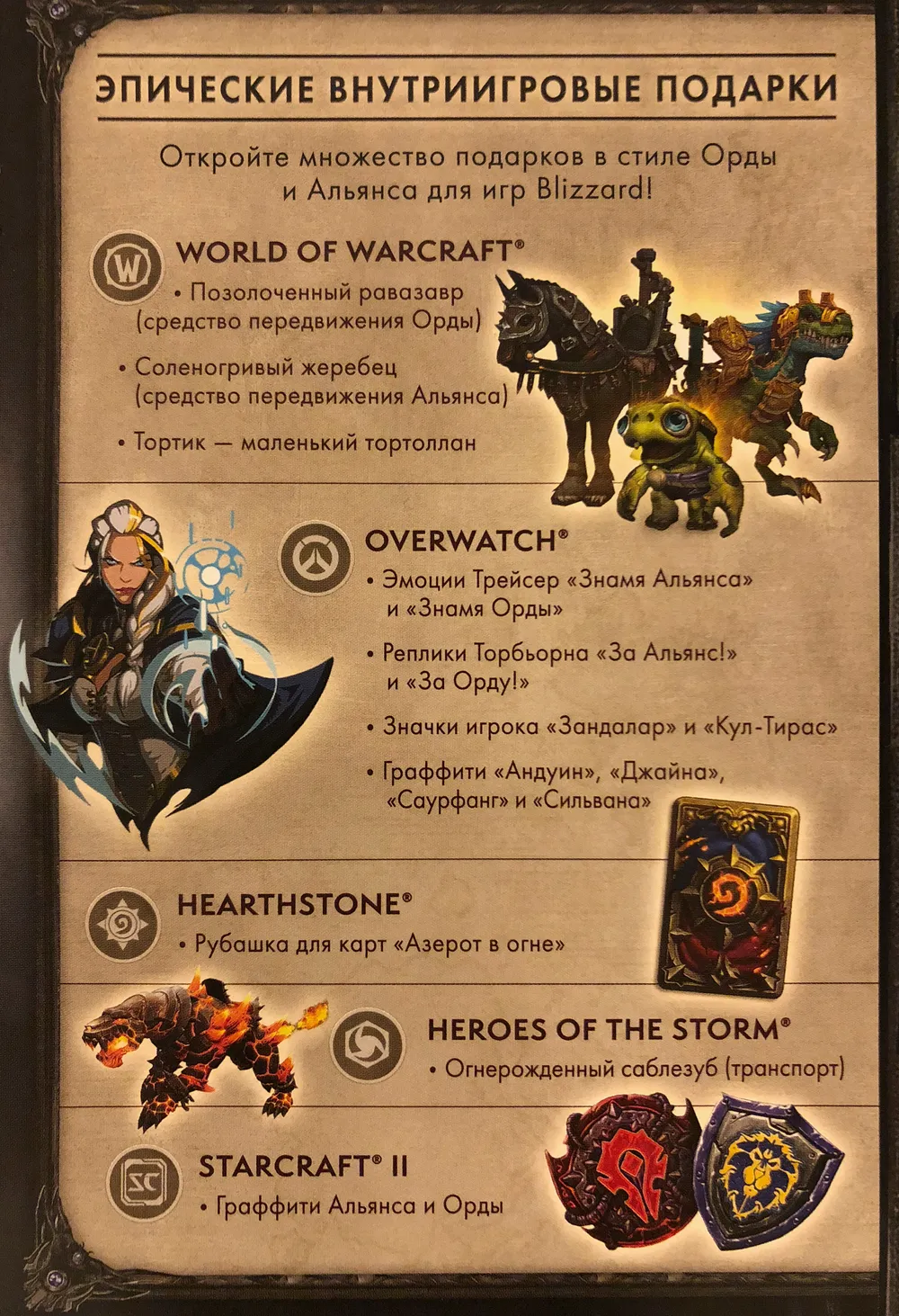 Помимо материальных плюшек, обладателям коллекционного издания «Битвы за Азерот» достанутся и виртуальные внутриигровые презенты в стиле Альянса и Орды. Их много, они разные и предназначены не только для World of Warcraft. Полный их список приводится на задней стороне коллекционной коробки.