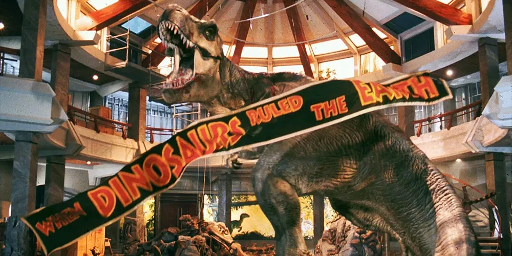 Математик рок-звезда с переломом ноги ерзает на заднем сиденье джипа. Что-то грохает совсем недалеко от него, заставляя воду в луже идти кругами. Математик нервничает и разговаривает сам с собой, нетерпеливо дожидаясь, когда из кустов выскочат охотник Роберт Малдун и палеоботаник Элли Сеттлер. Они запрыгивают в джип ровно в тот момент, когда из-за деревьев высовывается огромная кровожадная пасть тираннозавра. Он видит добычу, свирепо рычит и устремляется в погоню. Мы с сестрой вжимаемся в диванные подушки, видя, как морда тирекса отражается в зеркале заднего вида. Роберт Малдун переключает передачу, газует, и джип наконец-то вырывается вперед, оставляя позади "королевского ящера". Можно перевести дух, пусть и ненадолго.