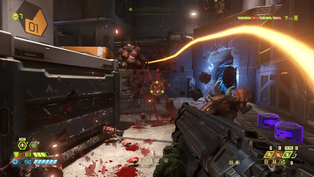 Хочу в этот раз начать с геймплея, так как самые значимые нововведения коснулись именно его. Что же поменяли? Разработчики решили усложнить и дополнить шутерные механики DOOM, добавив глубины и тактики. В новой части ограничили боезапас, и, в связи с этим, игроку теперь приходится добивать нежить, чтобы получить заветные патроны, плюс следует непременно распилить её бензопилой. Которая, в свою очередь, восстанавливается через энное количество времени, имея ограниченный боезапас. Что, безусловно, делает процесс добычи заветных патронов дольше и подвигает к рациональному распределению ресурсов в бою. Тепереча нужно десять раз подумать прежде, чем тратить лишние патроны в пылу сражения на одного противника. Сам палач научился делать рывки в стороны и подскакивать на перекладинах (для пущей манёвренности и эффектности в бою). В арсенале есть как новые пушки, так и старички. Из нового – замораживающие гранаты, наплечный извергатель пламени, Клинок палача, Баллиста, Горнило и Развоплотитель. В целом, функционально новые виды оружия более, чем полезны, но не все. Крио-гранаты помогают корректировать наступление полчищ демонов и на время останавливать опасных врагов. Извергатель пламени позволяет выбивать куски броне-пластин из врагов и зажаривать демонов до хрустящей корочки. Клинок Палача, конечно, понтовый, но руками гг тоже неплохо справлялся в прошлой части. Баллиста - это аналог уже всем известной Рельсы. Развоплотитель и Горнило – аналог BFG 9000 (по сути та же самая ульта, но визуально обыгранная иначе), что вносит определённое графическое разнообразие в игровой процесс, не более. Старое оружие осталось без каких-либо серьёзных изменений. Одного «старичка», двустволку, все же, модифицировали: к ней присобачили мясной крюк, чтобы притягивать себя к врагу и стрелять в упор. Теперь, в зависимости от вида атакуемой нежити, к ней требуется подбирать определённый вид оружия, чтобы не юзать одно и то же всю игру. К примеру, щитовики гораздо эффективнее выносятся с плазмогана. Конечно, теоретически можно их аннигилировать и со старого-доброго дрободана, но КПД будет значительно ниже. Появились дополнительные жизни, которые дают возможность продолжать бой даже после смерти, не откатываясь на ближайший чекпоинт.