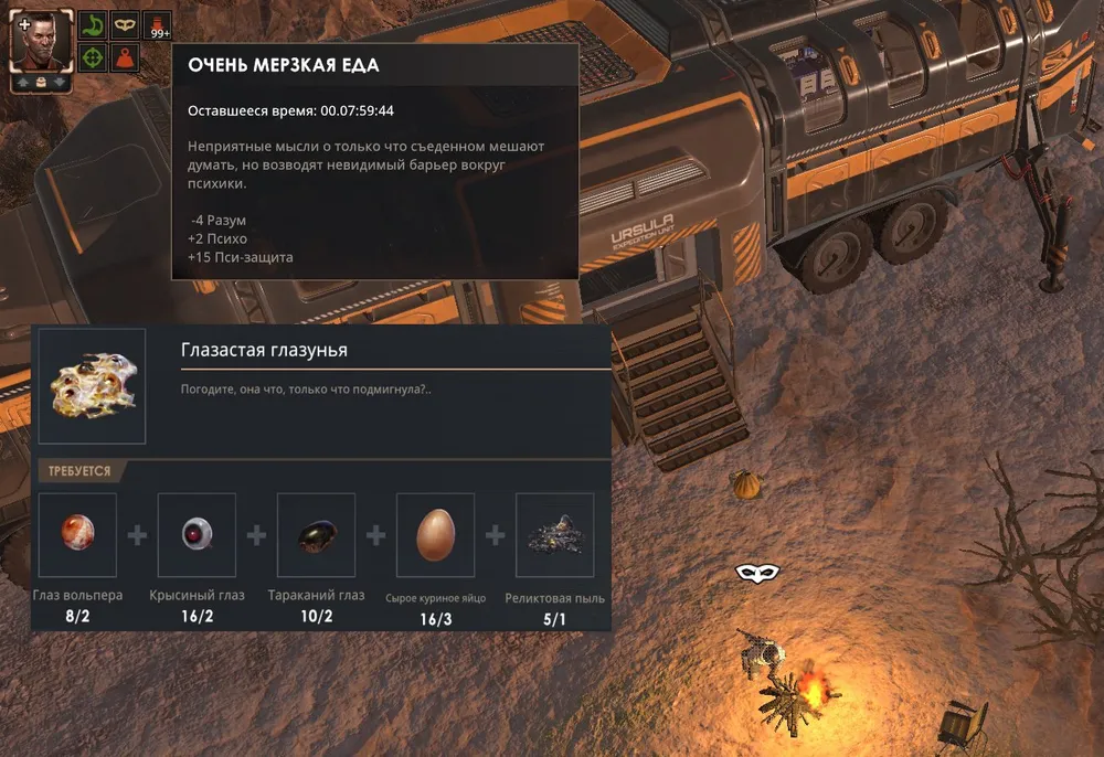 Правда, стоит обратить внимание на «Шашлык из гиены», дающий бонус к силе; к тому же он суммируется с бонусом от «Рваной свинины». Любителям пси-оружия может пригодиться «Глазастая глазунья» (б-р-р-р!): не из-за опыта за приготовление, а из-за эффекта.