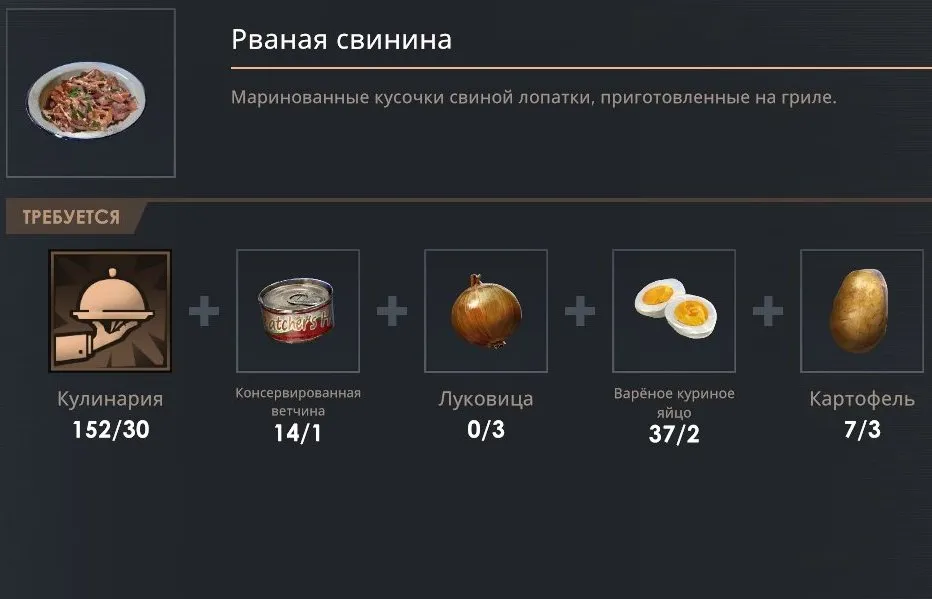 Точно также для приготовления «Жаркого из крысы» требуется самый дефицитный продукт Купола – лук; готовое блюдо не даёт хорошего бонуса, а по очкам за приготовление уступает «Рваной свинине», для изготовления которой также нужен лук.