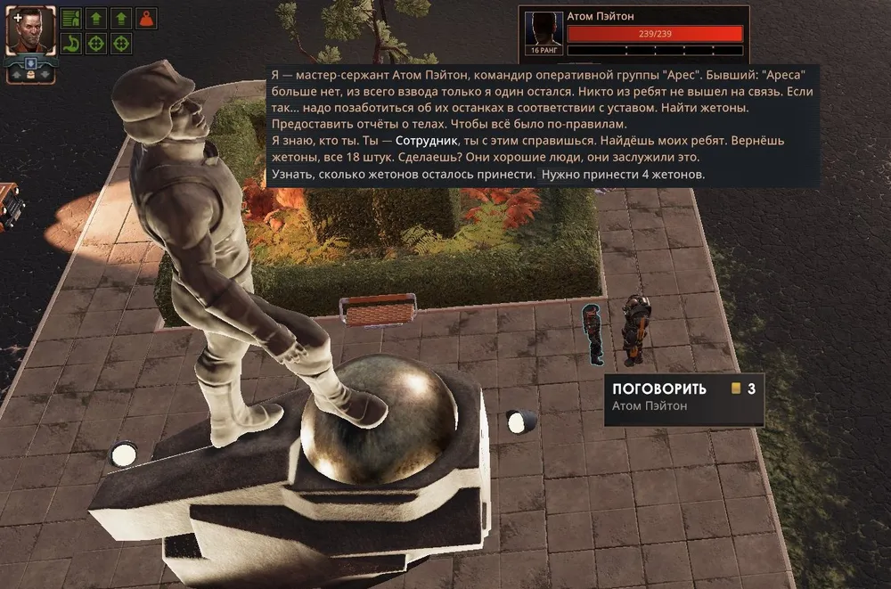 Итак, Город! Я прошёл через ворота, осмотрелся и тоскливо присвистнул: ничего себе! Громадная пустынная территория, лишь кое-где, как призраки, бродят отдельные люди. Пошёл вперёд и у памятника повстречал того, кому нужно отдать жетоны. Оказывается, я нашёл не все… Ещё раз обследовать все пустоши? Нет, благодарю покорно!