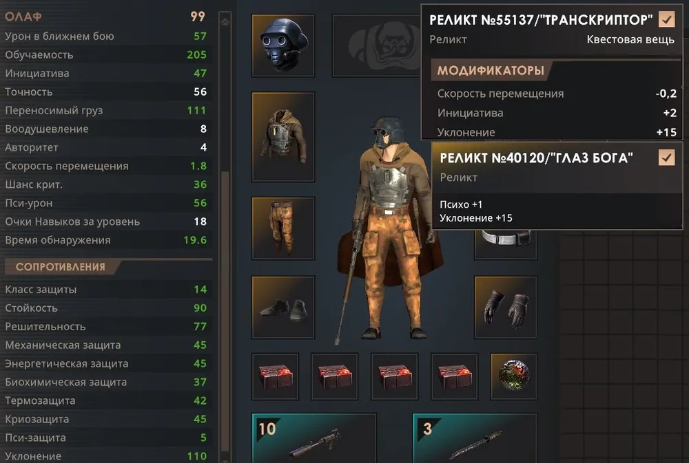 Ладно, но не зря же я купил целых четыре Транскриптора? Действие артефактов суммируется, самое время экипировать их и проверить, насколько хорошо сработает высокое «Уклонение» в ближнем бою? Да никак оно не работает! Даже при таком высоком показателе враги ухитряются наносить урон! Тьфу!