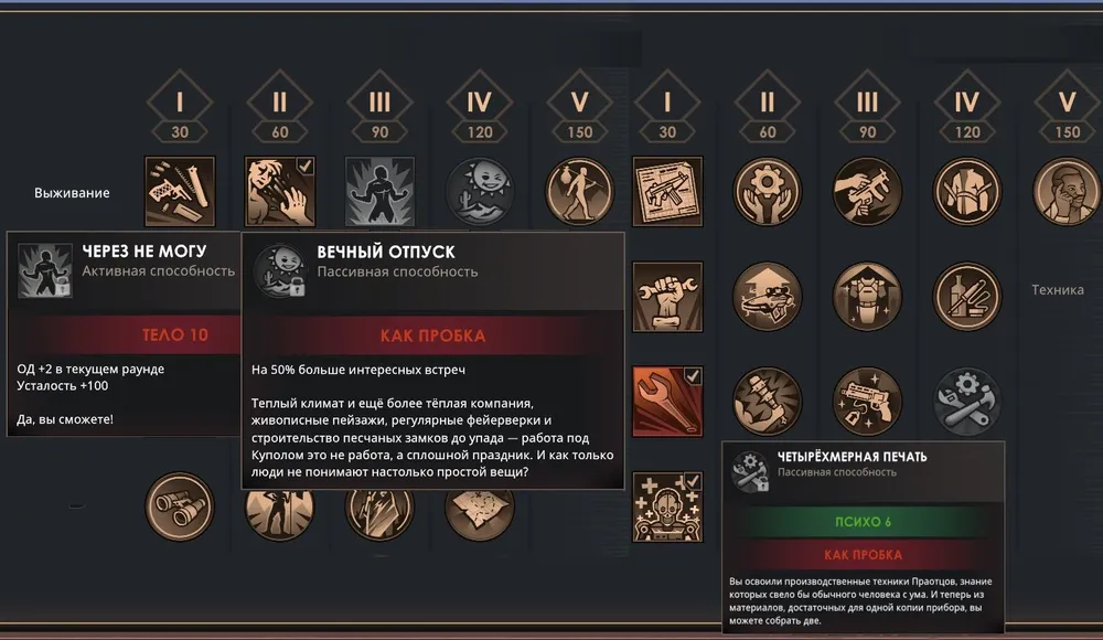 Да, довёл до максимума все умения и навыки, но кое-что так и осталось непонятным. Понятно, почему не «включился» «Вечный отпуск» - не активировано «Через не могу». Но почему не работает «Четырёхмерная печать», если все предыдущие способности активны?