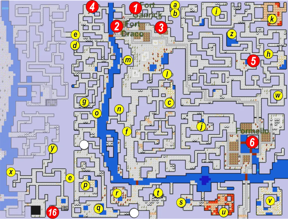 1 – форт Ганрик. 2 – форт Драко. 3 – усадьба Ганстон. 4 – пещера пауков. 5 – логово Мотракса. 6 – Формелло. 16. - Маленькая долина.